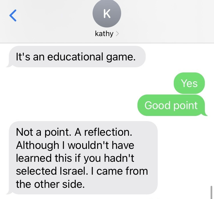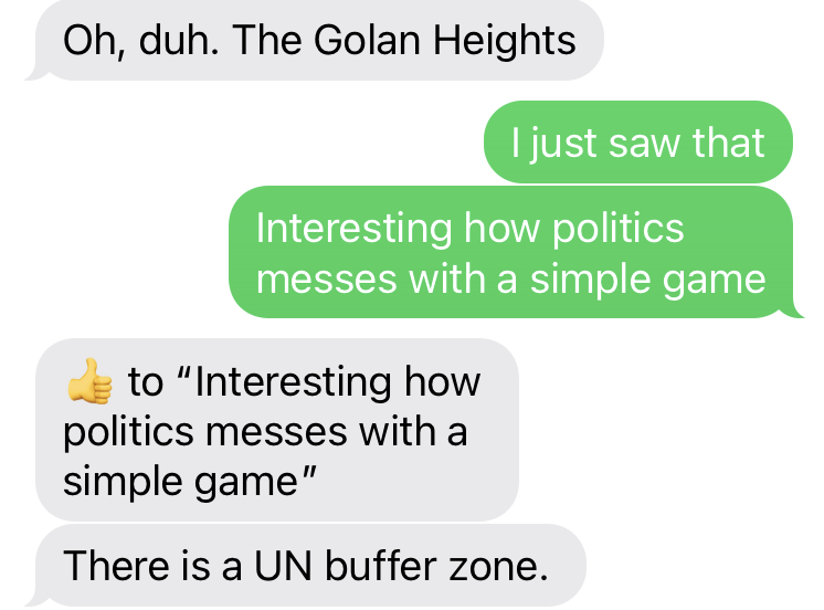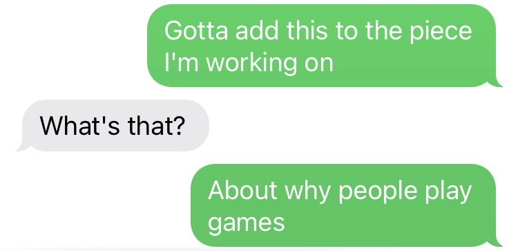 One: Most simply, a connection. A human connection. A sort of human connection. It’s intermediated, of course; we’re not together while we’re playing together. We’re not even talking. Even when we’re home at the holidays, and playing, we sit in our separate chairs looking at our separate phones, and still text each other the results! (That last bit might be my fault.) And yet, thanks to this intermediation, every day between us, we are able to send a message: I’m here. Are you there?