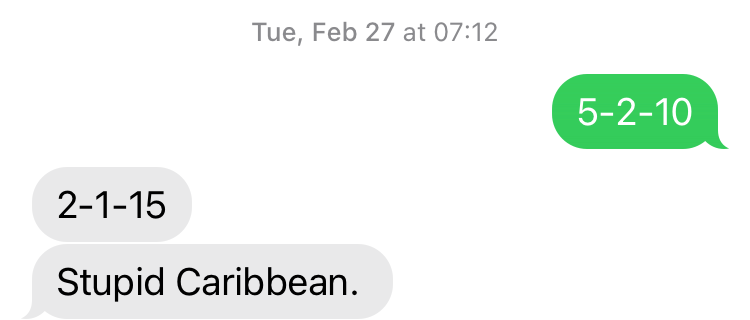 I think - Kathy will read this and it will spur further metadiscourse - a tacit agreement that this isn’t competition. Or it is competition. Or it’s competition but in a friendly way. The “winner” certainly never gloats; tomorrow either one of us might have a moment of stupidity or guess a combination of letters that leaves us with something like S_ORT, which might be SHORT, or SNORT, or SPORT, or depending on the depth of Wordle’s dictionary SKORT, and we’ll have to report the humiliating “bust.” And it is humiliating, just as a score of “2” is exhilarating.