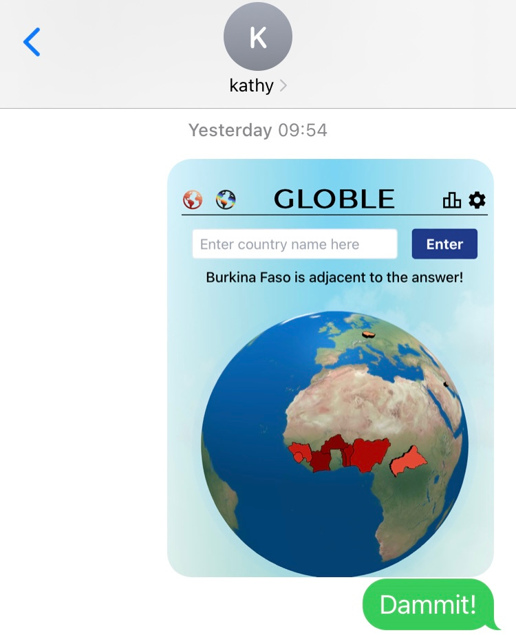 That said: For the past two years or so, my sister and I have played three games together almost every morning: Wordle, which everyone knows; Worldle, in which you have six chances to guess the name of a country from looking at its silhouette; and Globle, in which you have, and occasionally need, unlimited guesses to identify a secret country based on its distance from other countries. Worldle adds some bonus rounds about population and size and so on if you guess correctly.